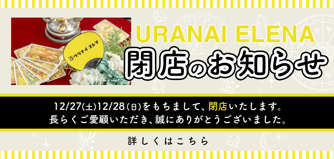 ウラナイエレナの閉店に伴い、アロマ占星術については、2025年12月にて終了します 今後、イベント的にご提供することもあるかと思いますが、常設のメニューとしてのご提供はありません 残り少ない日程ですがご興味あれば 【鑑定のご案内】ウラナイエレナでのアロマ占星術 https://divinus-jp.com/archives/60761